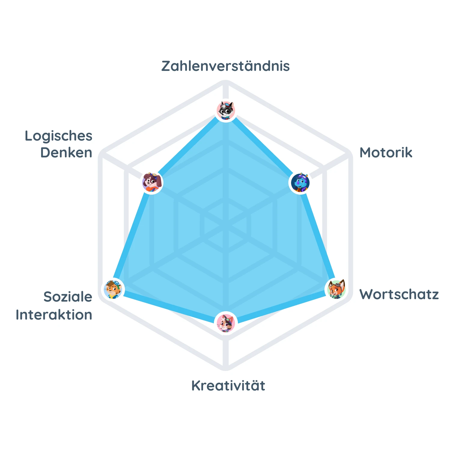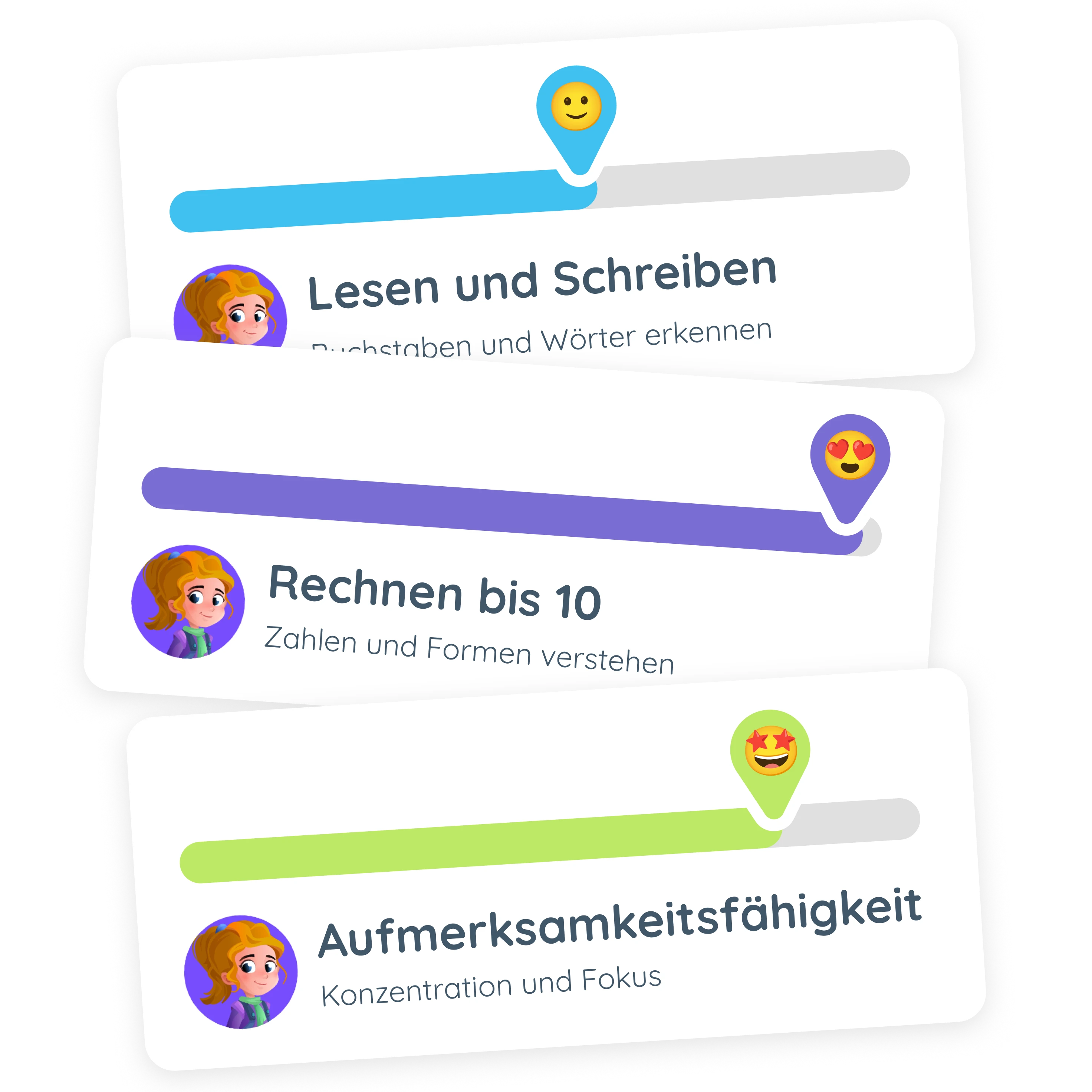 Unsere Schulstart-Übersicht zeigt dir spielerisch, wie gut dein Kind auf den Schulbeginn vorbereitet ist. Du erfährst auf einen Blick, in welchen Bereichen dein Kind bereits besonders stark ist und wo es noch neue Fähigkeiten entwickeln kann.
