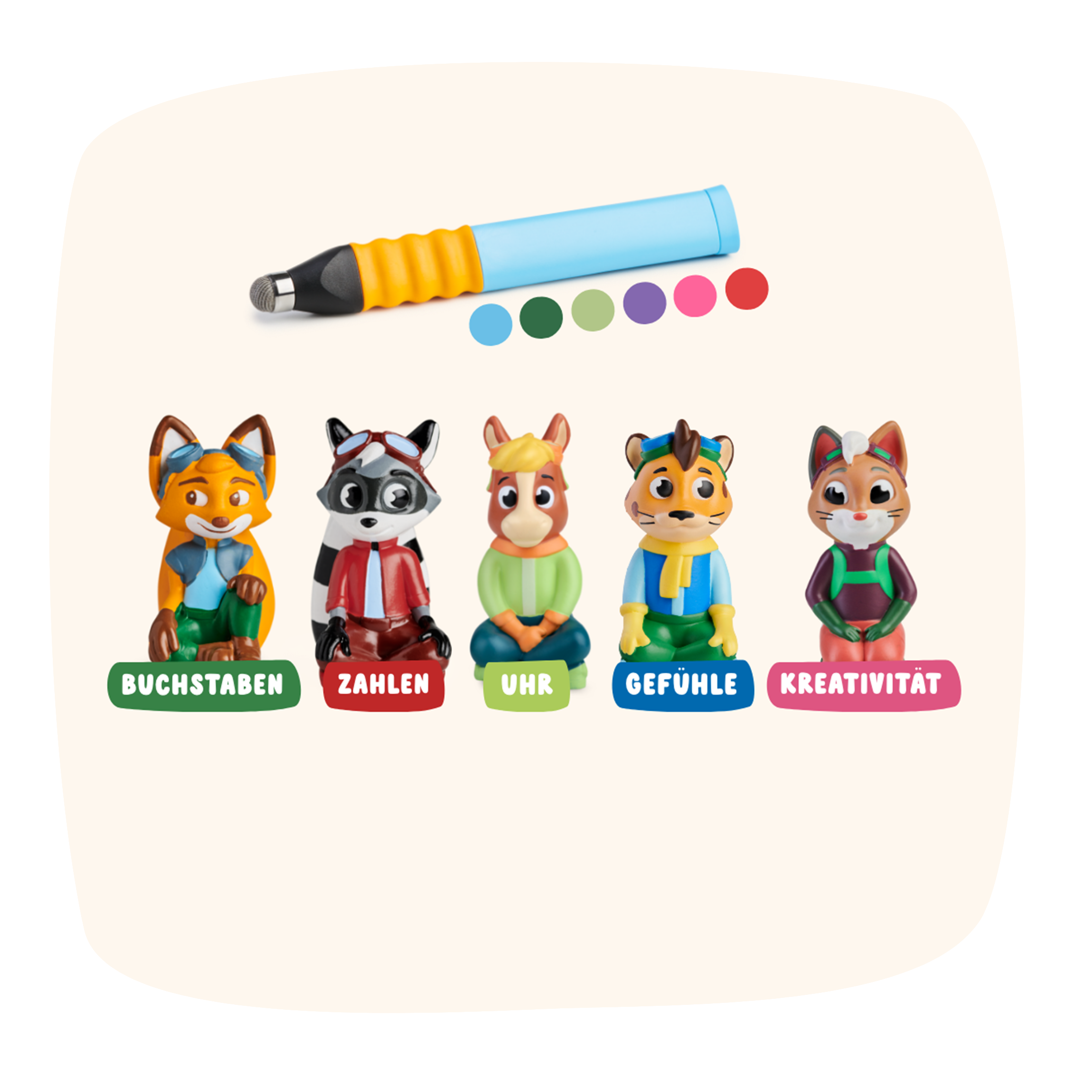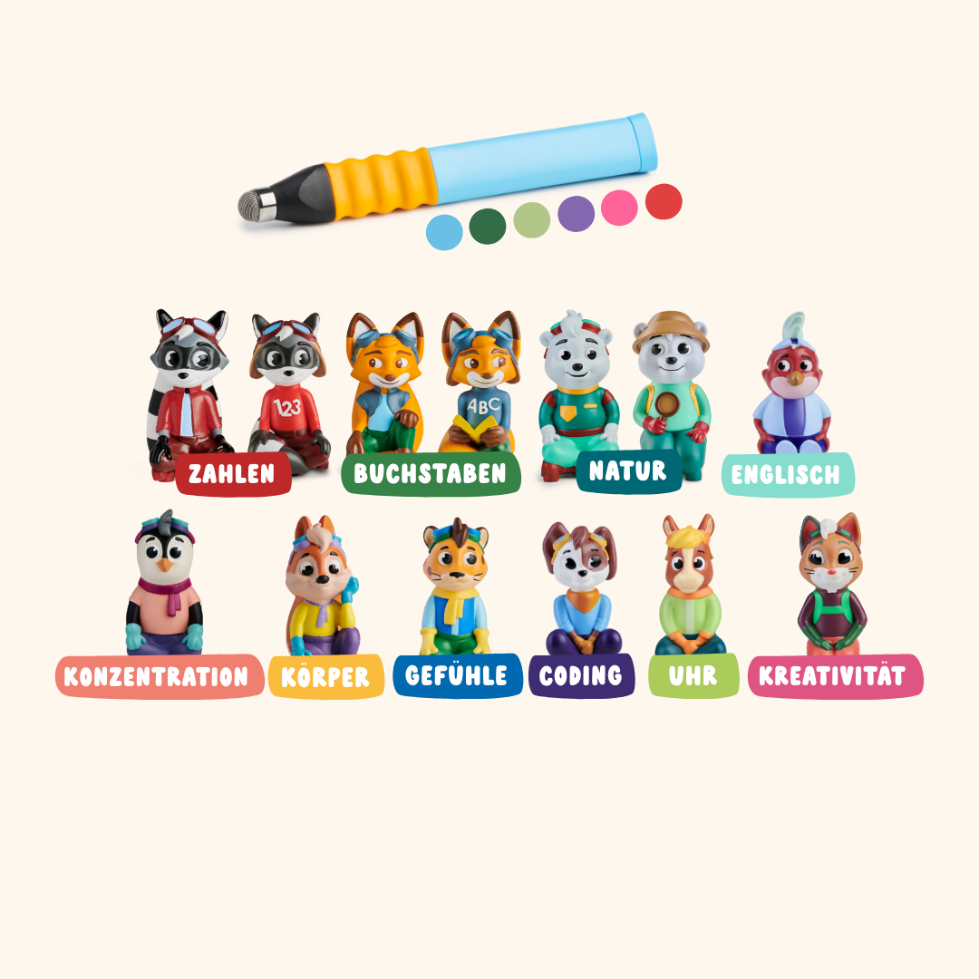 Jedes Starter- oder Sparset enthält unsere Figuren als Schlüssel zur jeweiligen Lernwelt, einen ergonomischen Eingabestift und den Zugang zu unserer Lern- und Spiel-App.